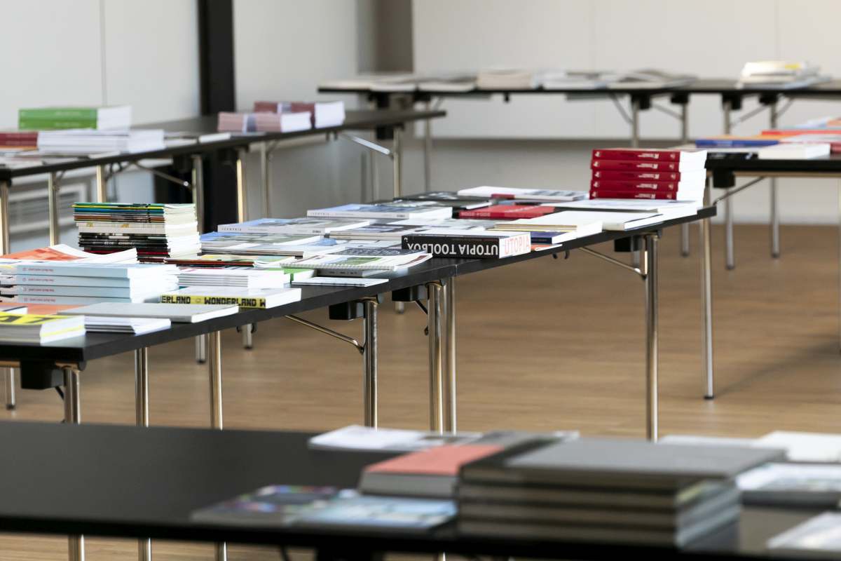 Die neuen Bücherregale wurden aus nicht mehr genutzten Platten und Beständen von bedruckten Ausstellungsmaterialien vom Architektur Haus Kärnten gebaut. Besonders die schwarz gefärbten MDF Platten der Ausstellung „Günther Domenig:DIMENSIONAL“ sind kreativ in Bücherregalen und dem mobilen Bücherturm verarbeitet.