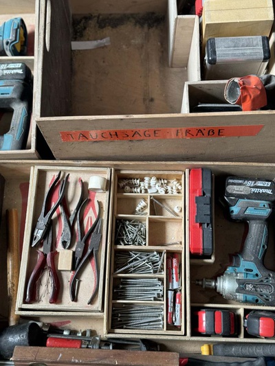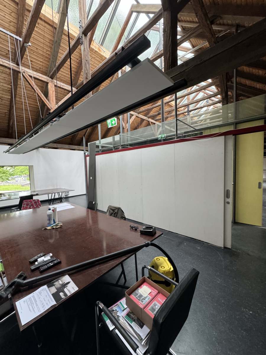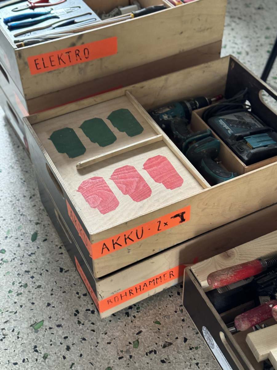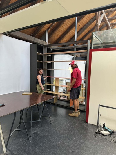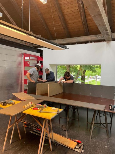 Die neuen Bücherregale wurden aus nicht mehr genutzten Platten und Beständen von bedruckten Ausstellungsmaterialien vom Architektur Haus Kärnten gebaut. Besonders die schwarz gefärbten MDF Platten der Ausstellung „Günther Domenig:DIMENSIONAL“ sind kreativ in Bücherregalen und dem mobilen Bücherturm verarbeitet.