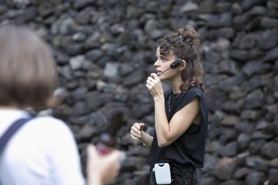 Ausgehend von der Erörterung der akustischen Begebenheiten und Besonderheiten im und um das Steinhaus und von der Befassung mit der Person Günther Domenig und seinem Werk erarbeitete Barbara Kaiser eine ortsbezogene Inszenierung mit einem Stimmensemble. Startpunkte für die Annäherung an diesen Ort bildeten für sie folgende Fragen: Welche Grundtöne lassen sich im und um das Gebäude finden? Wie lassen sich die vorgefundenen architektonischen Begebenheiten in Körperlichkeit und Klang übersetzen? Was wurde hier von Günther Domenig abgearbeitet und hat sich in diese Architekturskulptur eingeschrieben?