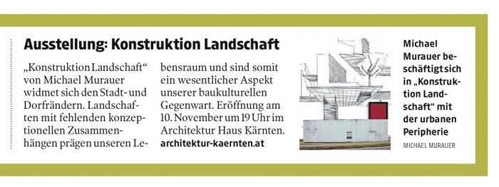 "Konstruktion Landschaft" von Michael Murauer widmet sich den Stadt- und Dorfrändern. Landschaften mit fehlenden konzeptionellen Zusammenhängen prägen unseren Lebensraum und sind somit ein wesentlicher Aspekt unserer baukulturellen Gegenwart. Eröffnung am 10. November um 19 Uhr im Architektur Haus Kärnten. architektur-kaernten.at