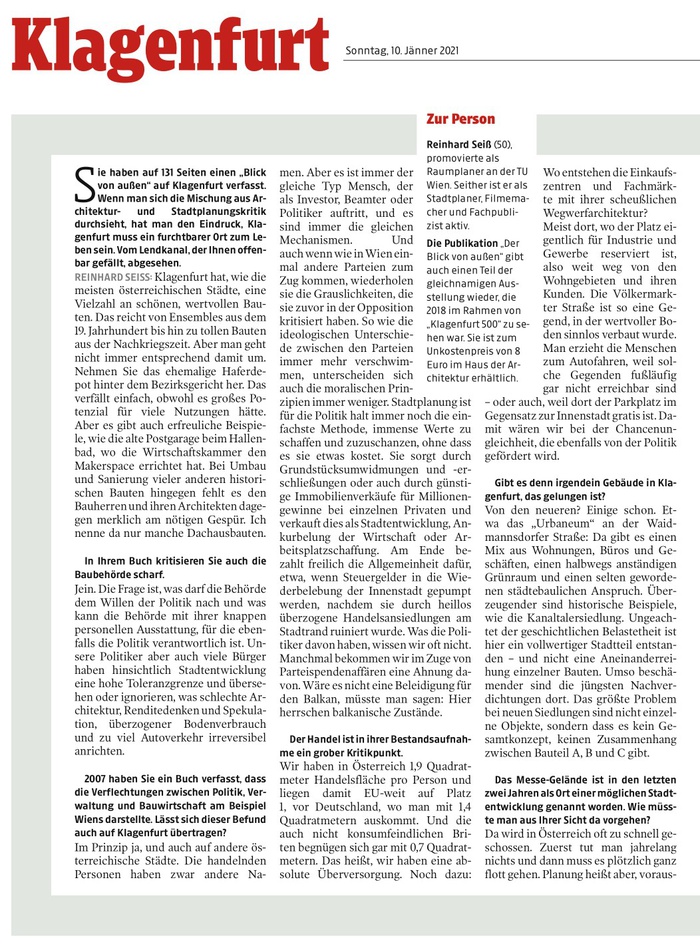 REINHARD SEISS: Klagenfurt hat, wie die meisten österreichischen Städte, eine Vielzahl an schönen, wertvollen Bauten. Das reicht von Ensembles aus dem 19. Jahrhundert bis hin zu tollen Bauten aus der Nachkriegszeit. Aber man geht nicht immer entsprechend damit um. Nehmen Sie das ehemalige Haferdepot hinter dem Bezirksgericht her. Das verfällt einfach, obwohl es großes Potenzial für viele Nutzungen hätte. Aber es gibt auch erfreuliche Beispiele, wie die alte Postgarage beim Hallenbad, wo die Wirtschaftskammer den Makerspace errichtet hat. Bei Umbau und Sanierung vieler anderen historischen Bauten hingegen fehlt es den Bauherren und ihren Architekten dagegen merklich am nötigen Gespür. Ich nenne da nur manche Dachausbauten.