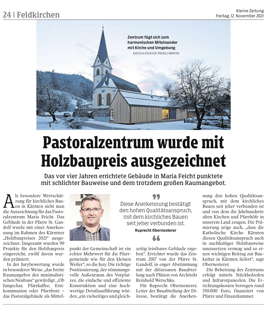 Kleine Zeitung: "Pastoralzentrum wurde mit Holzbaupreis ausgezeichnet"