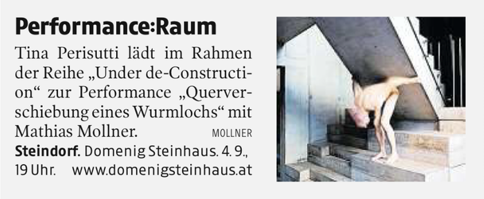 Tina Perisutti lädt im Rahmen der Reihe "Under de-Construction" zur Performance "Querverschiebung eines Wurmlochs" mit Mathias Mollner.