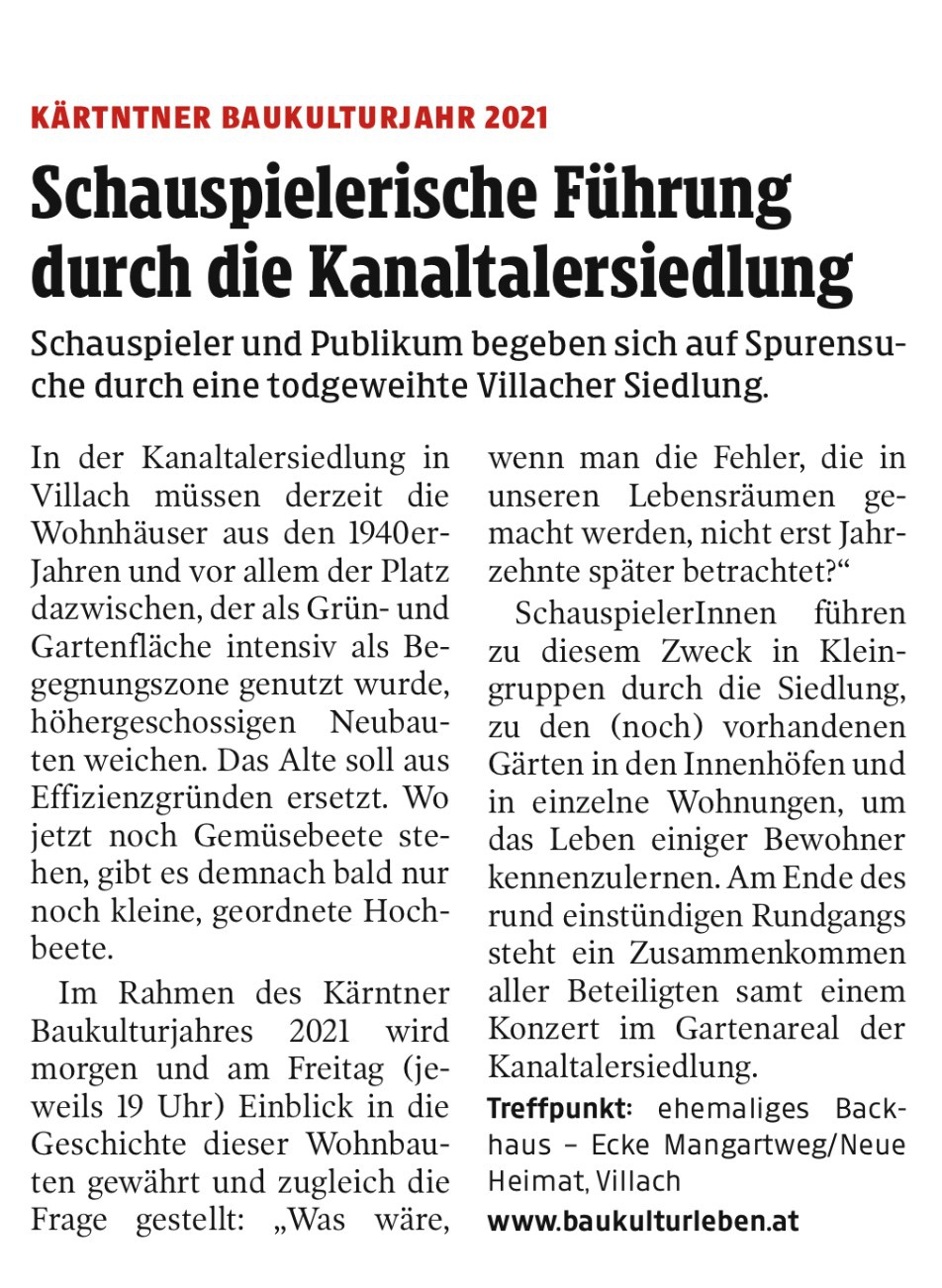 Kleine Zeitung: "Schauspielerische Führung durch die Kanaltalersiedlung"