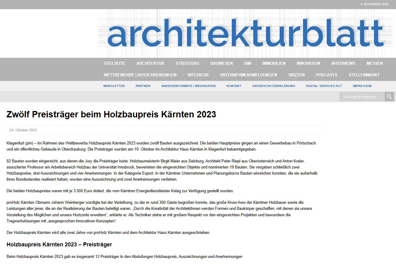 www.architekturblatt.de: "Zwölf Preisträger beim Holzbaupreis Kärnten 2023"