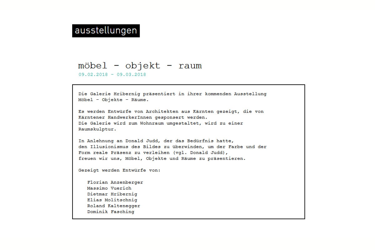 Die Galerie Hribernig präsentiert in ihrer kommenden Ausstellung Möbel - Objekte - Räume.