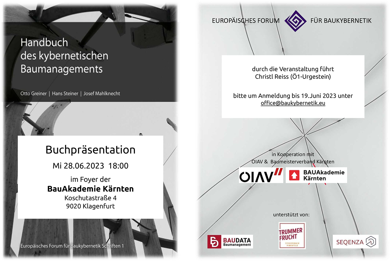 BuchpräsentationAuf Grund des großen Erfolges der Präsentation in Wien wird das gemeinsame Werk von Otto Greiner, Hans Steiner und Josef Mahlknecht in Kooperation mit dem ÖIAV und dem Kärntner Baumeisterverband nochmals einem kybernetik-interessierten Publikum dargebracht.