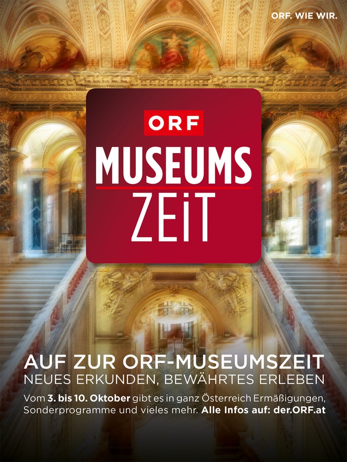 Neues erkunden, Bewährtes erleben: Österreichweit eine ganze Woche lang Kunst und Kultur entdecken, mit zahlreichen Benefits der Museen und einem bunten Programm für die Besucherinnen und Besucher. Vom 3. bis 10. Oktober gibt es im Rahmen der „ORF-Museumszeit“ in allen teilnehmenden Häusern unter dem Label „ORF-Ticket“ eine Woche lang besondere Aktionen wie beispielsweise Ermäßigungen, Sonderprogramme, Kinderextras und vieles mehr. Alle Informationen rund um die „ORF-Museumszeit“ finden sich im Internet unter: der.ORF.at/museumszeit