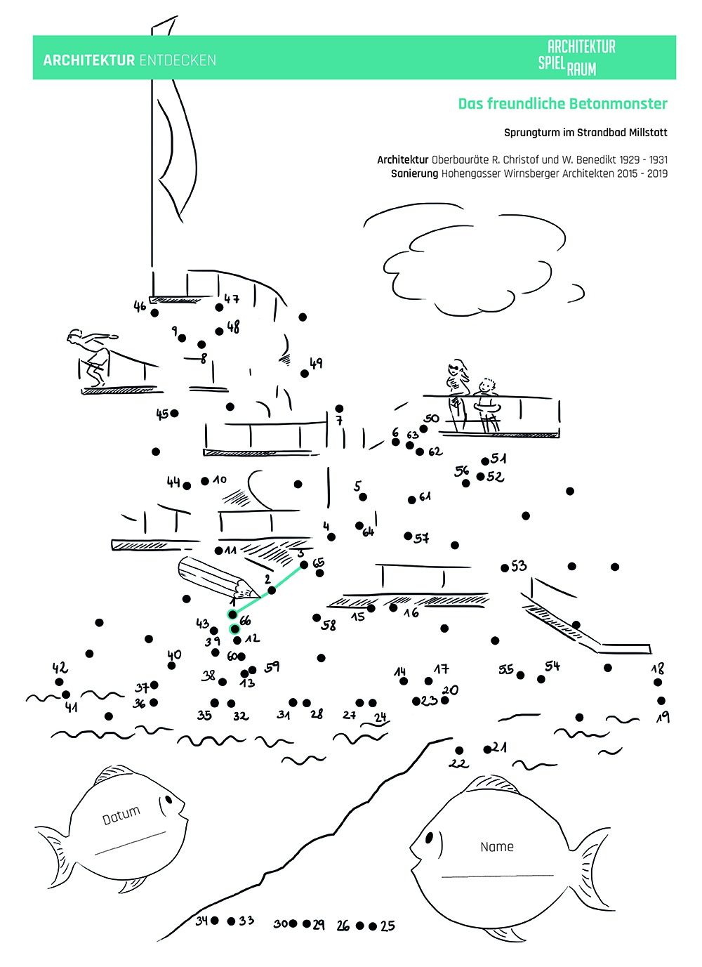 Die Arbeitsblätter können als Vermittlungsinstrument in Schulen und baukulturellen Institutionen eingesetzt werden und sollen zum Besuch der jeweiligen Bauwerke anregen. Die ansprechend gestalteten Karten laden Baukulturvermittler*innen, Jugendliche, Kinder, Pädagog*innen und Schulklassen zum Mitmachen ein: Kurze geschichtliche Informationen zur Entstehung des Bauwerks, Besonderheiten, Materialkunde und interessante Eckdaten wechseln sich mit konkreten Fragestellungen und Hinweisen auf weiterführende Literatur ab. Ein spannendes Punkt-zu-Punkt Bild ermöglicht es, das Bauwerk auch mit dem Stift zu „entdecken“ und die Scheu vor dem Selber-Zeichnen zu überwinden.