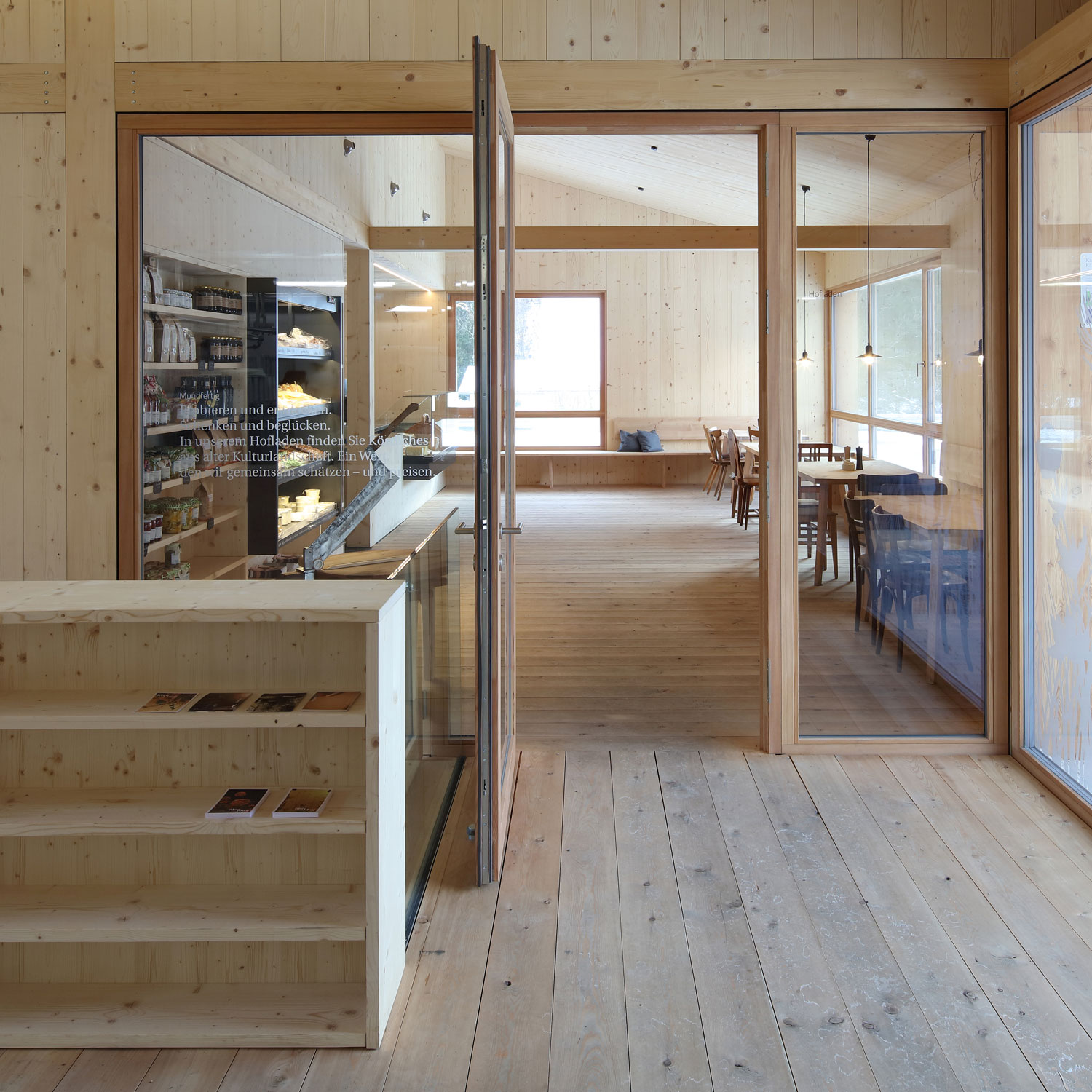 Die Typologie der Lab’n, dem ost-west-orientierten, durchgesteckten Kaltraum, wurde dem Kärntner Bauernhaus der Nockberge entlehnt und zum zentralen, zweigeschoßigen Erschließungsraum abgewandelt. Wenngleich das Durchhaus nicht zwangsläufig dem Ort entspricht, ermöglicht es Einblicke in die hochtechnologisierten Produktionsprozesse, lenkt in die helle Imbiss- und Verkaufsstube in Holz und führt hinab zu Lagerpflege und anregend einfachen Wissensvermittlung rund um Kuh, Käse und Milchwirtschaft im interaktiv wirksamen, analogen Schubladenschrank. Ortsbaulich markiert der Längsbaukörper die Einfahrt zum Ortszentrum, gestalterisch wurde die Aufgabe bis ins kleinste Detail durchdacht und angemessen ausformuliert, die funktionellen Abläufe sind optimiert und gut ablesbar, die Materialisierung in Holz ist CO² neutral und manifestiert das Bio-Thema durch und durch.