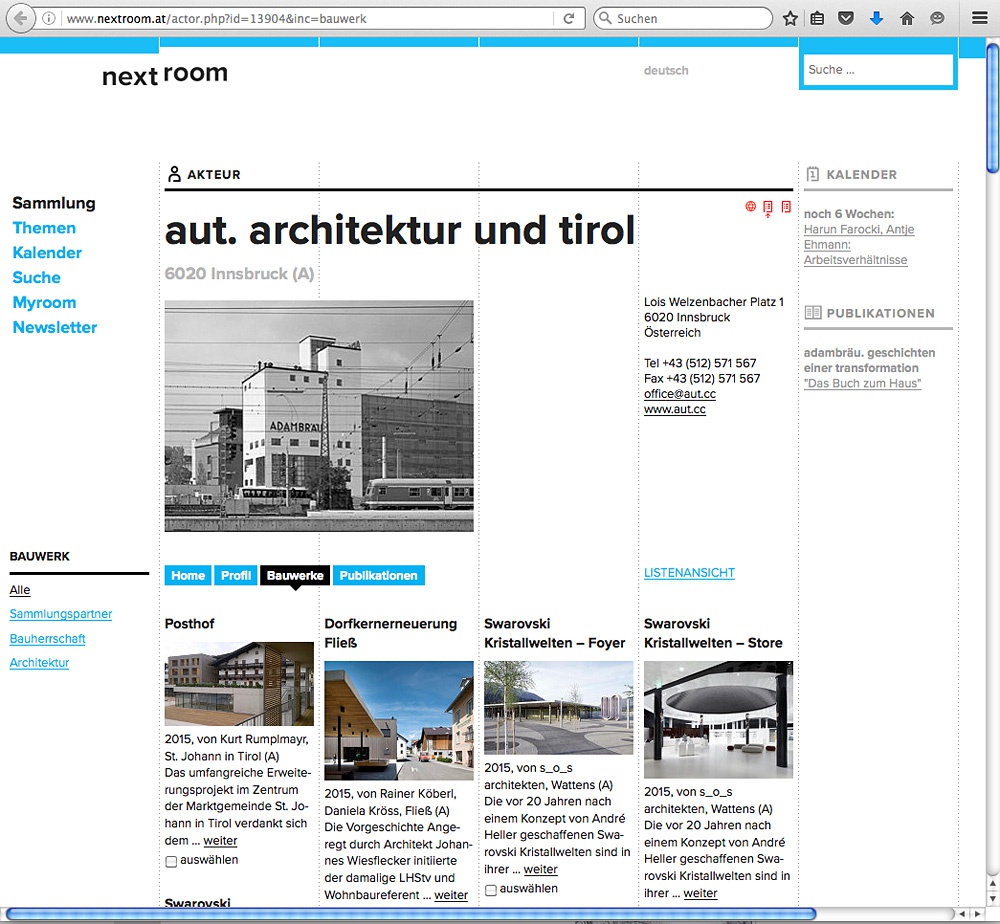 Als ein wichtiger Bestandteil der Vermittlungsarbeit wird seit 2003 die „Tiroler Baudatenbank“ als Teil der Internetplattform nextroom betrieben. Diese Sammlung ausgewählter Tiroler Architektur entstand auf der Basis des von Otto Kapfinger zusammengestellten und inzwischen vergriffenen Führers „Bauen in Tirol seit 1980“. Sie wird laufend von aut. architektur und tirol um neue Objekte erweitert und bietet mit inzwischen über 1.000 Bauwerken einen repräsentativen Querschnitt durch die aktuelle Architekturszene in Tirol.