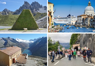 Presseunterlagen zu der von Juni bis Oktober 2025 im aut gezeigten Ausstellung des Architekturzentrum Wien, die zentrale Aspekte des Tourismus beleuchtet und nach Transformationspotenzial sucht.