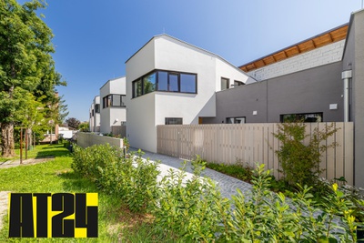 Die Häuser liegen im Zentrum von Guntramsdorf. In einem städtebaulich heterogenen Umfeld verbinden sie bestehende mit neuer Architektur. X42 Architektur hat die Wohntypologie „Reihenhaus“ für diesen speziellen Ort neu interpretiert: Der bestehende Gebäudeteil der ehemaligen Schuhleistenfabrik an der Hauptstraße wurde umgebaut und erweitert. Im hinteren Teil des Nord-Süd gestreckten Grundstücks haben die PlanerInnen sieben Stadthäuser mit jeweils einem eigenen, vorgelagerten Garten auf einem offenen Garagendeck in einer Zeilenstruktur angeordnet. Die Aufenthaltsräume im Erdgeschoss orientieren sich zu diesen introvertierten Gärten hin.