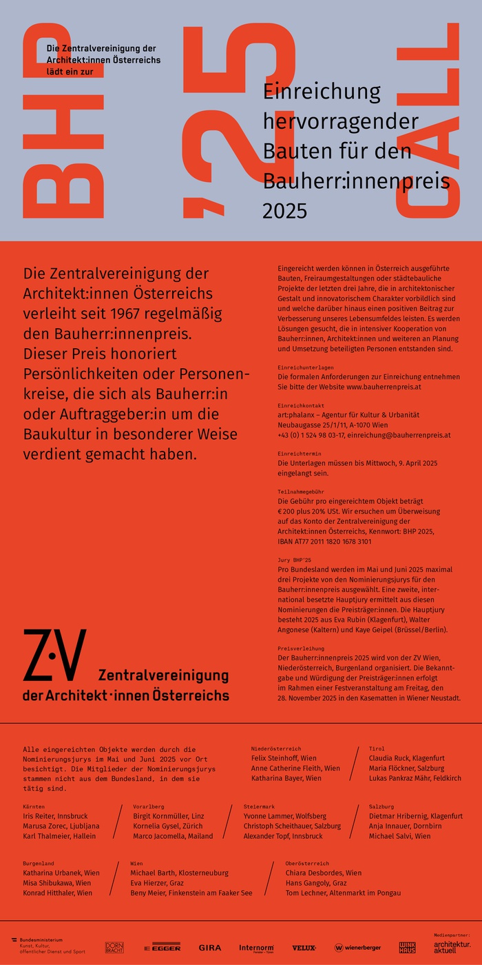Auch in diesem Jahr sucht die Zentralvereinigung der Architekt:innen Österreichs wieder beispielhafte Bauprojekte in Österreich für den Bauherr:innenpreis 2025.