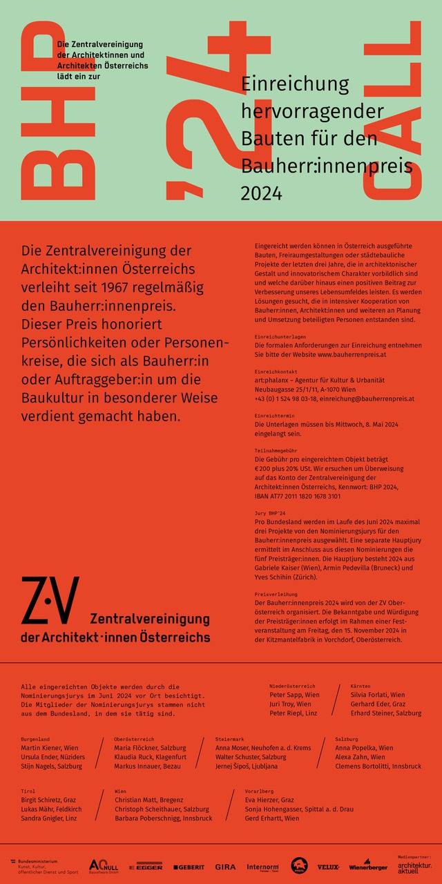 Der Bauherr:innenpreis 2024 wird von der ZV Oberösterreich organisiert. Die Bekanntgabe und Würdigung der Preisträger:innen erfolgt im Rahmen einer Festveranstaltung am Freitag, den 15. November 2024 in der Kitzmantelfabrik in Vorchdorf, Oberösterreich