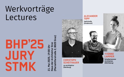 Steiermark, Werkvortrag, Bauherrenpreis, JuryAm Mittwoch den 21. Mai gibt es die Gelegenheit die steirischen Nominierungsjuror:innen für den BHP'25 kennenzulernen und mehr über ihre Arbeit zu erfahren.