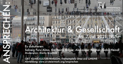 Steiermark, Diskussion, Online, AnsprechenDie gebaute Umwelt ist Lebensraum für die Gesellschaft und prägt diese durch ihre Omnipräsenz. Wie weit geht die Verantwortung der Architektur? Trägt/übernimmt die Gesellschaft auch Verantwortung für die Architektur?