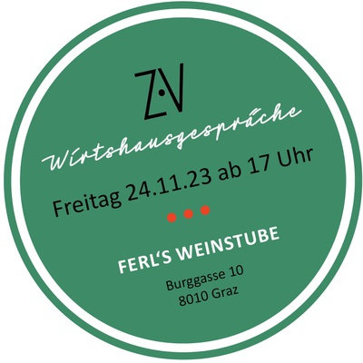 Steiermark, Wirtshausgespräch, Netzwerktreffen, Offener AustauschSeit Oktober 22 lädt die ZV Steiermark einmal im Monat zum offenen und ungezwungenen Austausch für alle Architekturinteressierten. Die Treffen finden immer Freitags ab 17 Uhr in verschiedenen "Wirtshäusern" statt. Nächster Termin 24.11. ab 17 Uhr in Ferl's Weinstube, Burggasse 10, 8010 Graz.