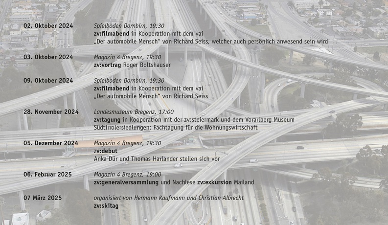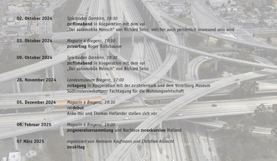 Aktuelles, Vorarlberg, Programm, FilmabendAn zwei Abenden im Oktober zeigen wir in Kooperation mit dem vai den Film „Der automobile Mensch“ von Richard Seiss. Die Dokumentation ist ein aufrüttelndes Plädoyer für eine grundlegende Verkehrswende, die deutlich über die aktuellen politischen Zielsetzungen hinausgeht.